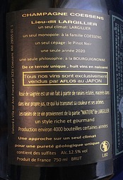 醸造スタイル:完熟したブドウのみを選果。2020 年8月より醸造開始。マセラシオンは約12時間。マロラクティック発酵の後、澱と共に29か月の熟成。デゴルジュマン:2023年11月