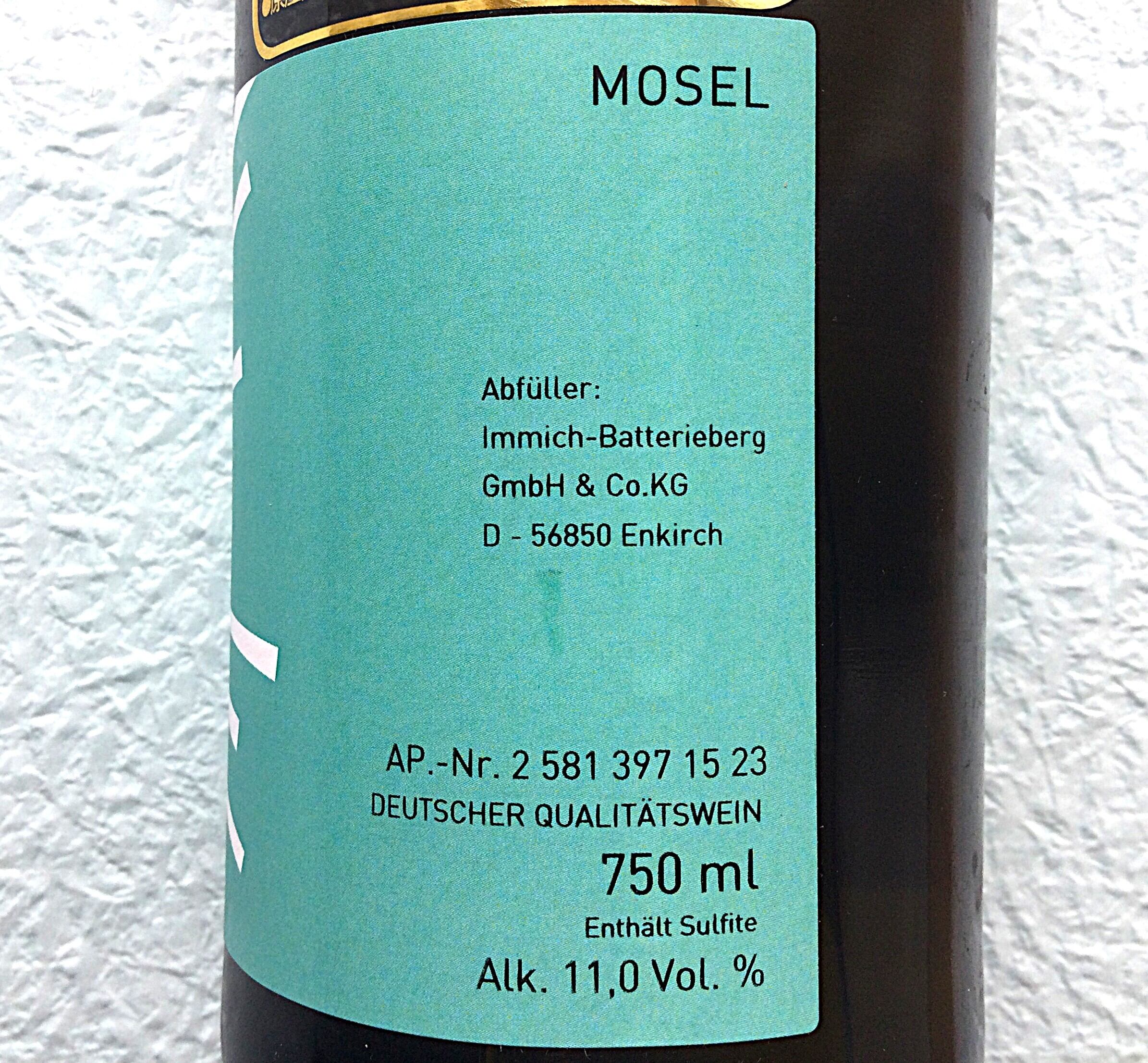 イミッヒ・バッテリーベルクの「イミッヒ」は、1425年から醸造所を切り盛りしてきたイミッヒ家に由来する。そして「バッテリーベルク」は、19世紀半ば、モーゼル川沿いの急斜面を爆破して、ブドウ畑を造成した際の轟音を、砲兵隊Batterieの砲撃に例えたことに因んでいる。そして2009年から、ザールのファン・フォルクセン醸造所で2003年まで醸造責任者だったゲルノート・コルマンが、経営と醸造を担っている。13ヘクタールのブドウ畑の大半が、1868年のプロイセン王国政府の格付け地図で、グラン・クリュに格付けされている。急峻なブドウ畑で、樹齢80年以上の自根の古木が多い。その収穫は、9世紀まで遡る醸造所の地下にある、玄武岩の柱が支える石造りのセラーで醸造される。微量の亜硫酸以外の添加物を一切使わずに、野生酵母だけで発酵した、目の覚めるような味わいのリースリングである。(輸入元情報より)