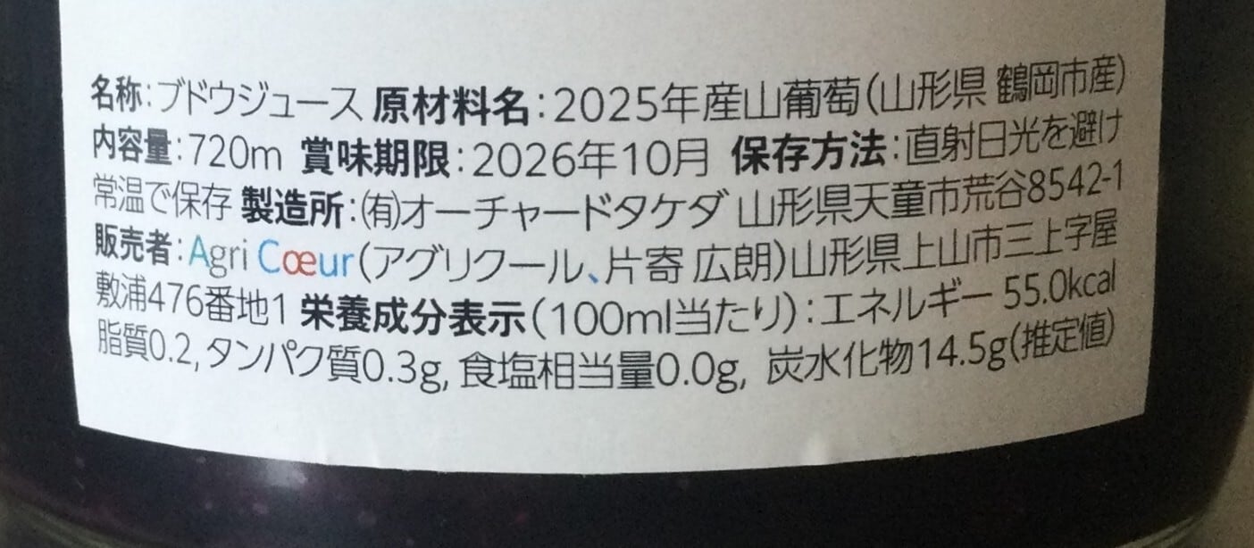 ジュースは冷やすことで酒石酸カリウム(ガラス片のような結晶や板状)が析出致しますが避けてお飲みください。