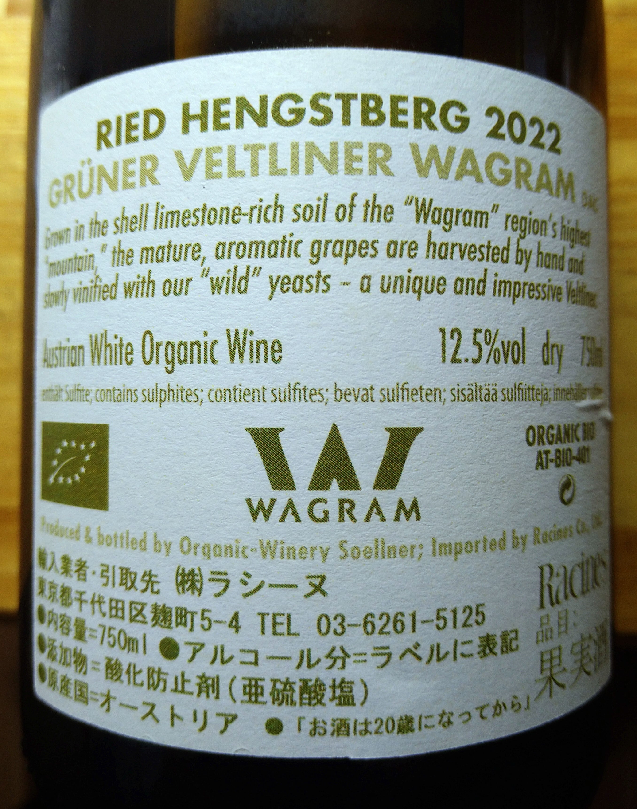 健全に完熟したブドウを慎重に圧搾、ステンレスタンクで野生酵母により発酵。澱の上で約2ヵ月熟成後、収穫翌年1月に珪藻土のフィルターにかける。その後ステンレスタンクで瓶詰まで熟成。ヴァグラムで最も標高の高いヘングストベルクの山の南向き斜面の畑。繊細でエキゾチックな香りが飲み手を誘い、華やかで調和のとれたおだやかな果実味が特徴。品のある味わい。(輸入元情報より)